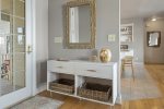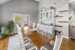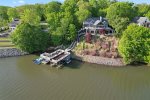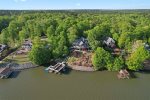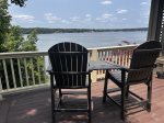The main floor has an open floor plan which features a beautiful stone fireplace (not operational), a kitchen with a large Sub-Zero fridge, 6 burner Viking gas range, double ovens, a separate ice maker, an eat-in island that seats 3, a big dining area (table seats 8), a built-in bar and an additional outdoor seating for 10. There is a half bathroom and a big laundry and pantry room off the entryway. This room is perfect for storing food and coolers for multiple families, plus it has a full size freezer so you can stock up for the week. Off the main living area is a King bedroom with a full en-suite bathroom that opens up to an oversized deck overlooking the lake. After dinner, relax on the deck by the fire table and wait for a full sky of stars to show up!