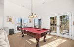 The downstairs recreation level features a 2nd King bedroom with a full en-suite bathroom that opens up to another oversized deck overlooking the lake. There are 2 additional bedrooms on this floor that share a full bathroom (1 Queen, 1 Bunk room). 13 foot ceilings and panoramic windows allow the same natural light you get upstairs to come in the expansive walkout basement. There is a “fun zone” with a pub table perfect for playing cards/games, a large TV for movie time, pool table, and wet bar area for entertaining. Or step outside to enjoy a casual and comfortable oversized deck area that has more games like darts, ring toss and a ping pong table. There are also plenty of comfy chairs to sit and relax or read a book.