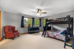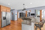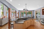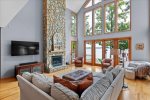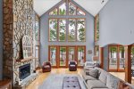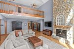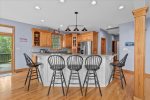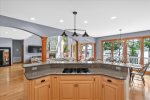 Inside, the home boasts a spacious open floor plan with a cozy fireplace, ideal for gathering together. The modern kitchen, equipped with an island bar, makes meal prep a breeze, while offering stunning lake views from inside. Whether you're enjoying a meal, lounging in the living room, or relaxing in one of the five comfortable bedrooms, you'll always be reminded of the beauty that surrounds you.